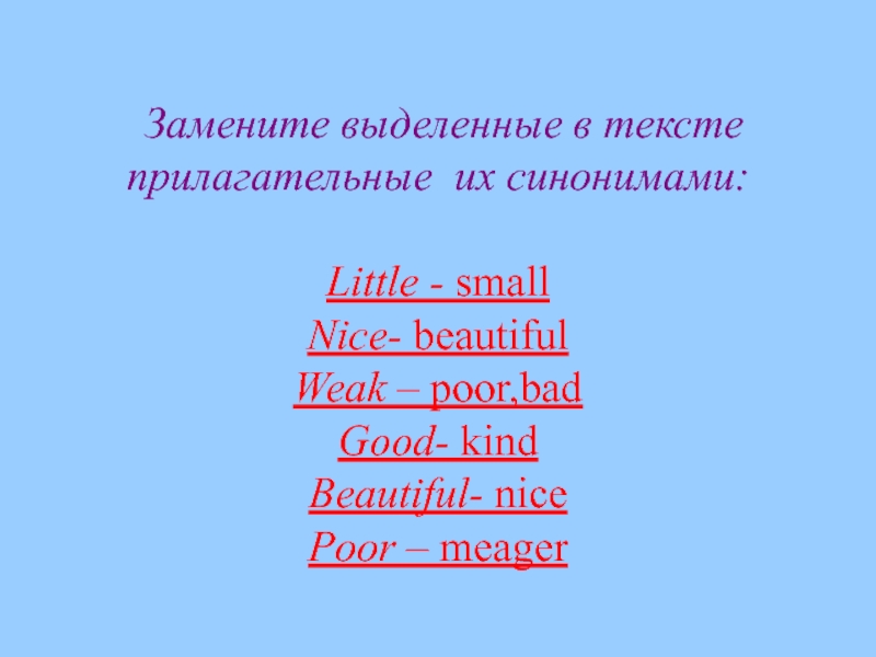 Слайд 32 Замените выделенные в тексте прилагательные их синонимами:
