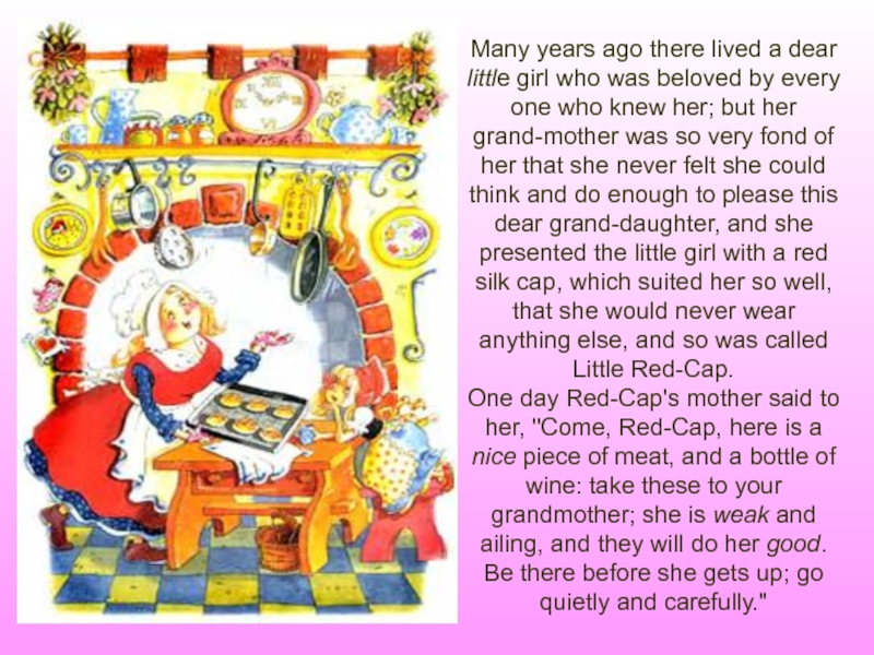 One day Red-Cap's mother said to her, "Come, Red-Cap, here is a nice piece of meat, and a bottle of wine: take these to your grandmother; she is weak and ailing, and they will do her good. Be there before she gets up; go quietly and carefully."