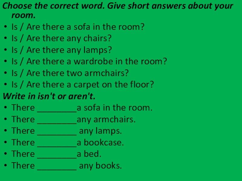 Слайд 24Choose the correct word. Give short answers about your room.