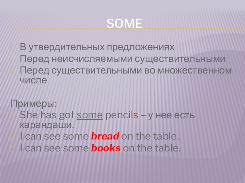 SomeВ утвердительных предложенияхПеред неисчисляемыми существительными Перед существительными во множественном числеПримеры:She has got some pencils – у нее