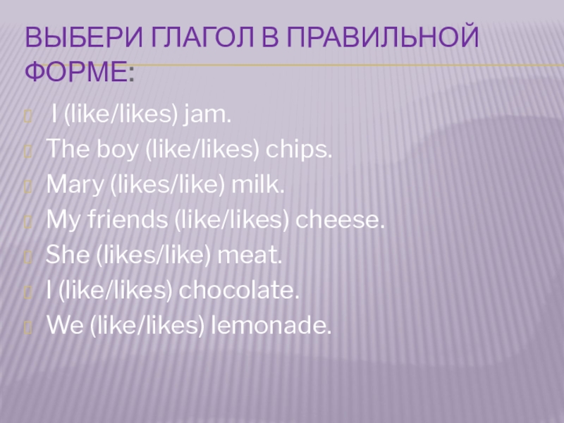 Выбери глагол в правильной форме: I (like/likes) jam.The boy (like/likes) chips.Mary (likes/like) milk.My friends (like/likes) cheese.She (likes/like)