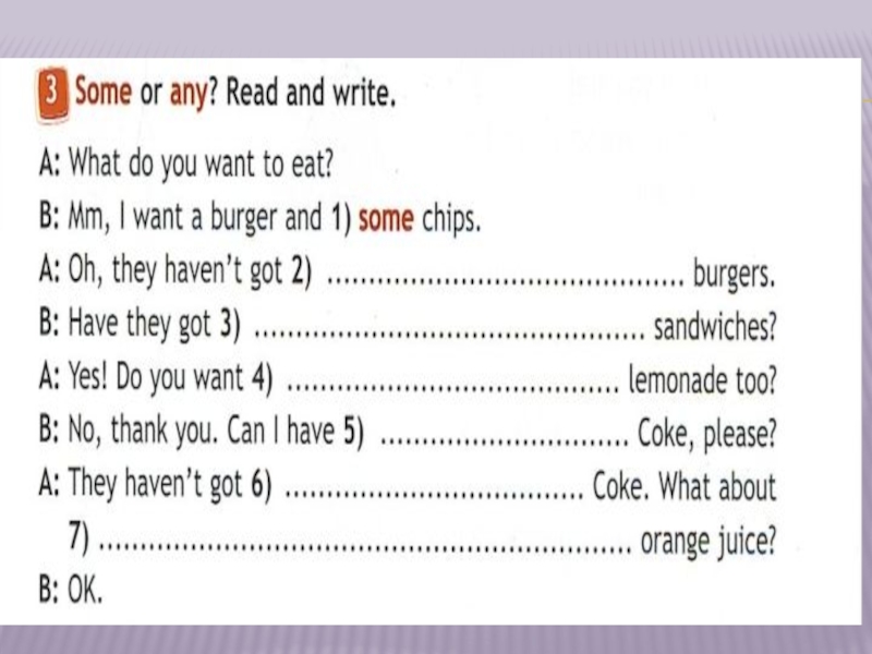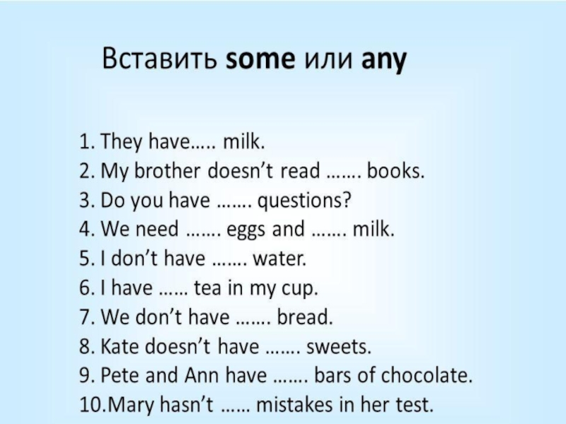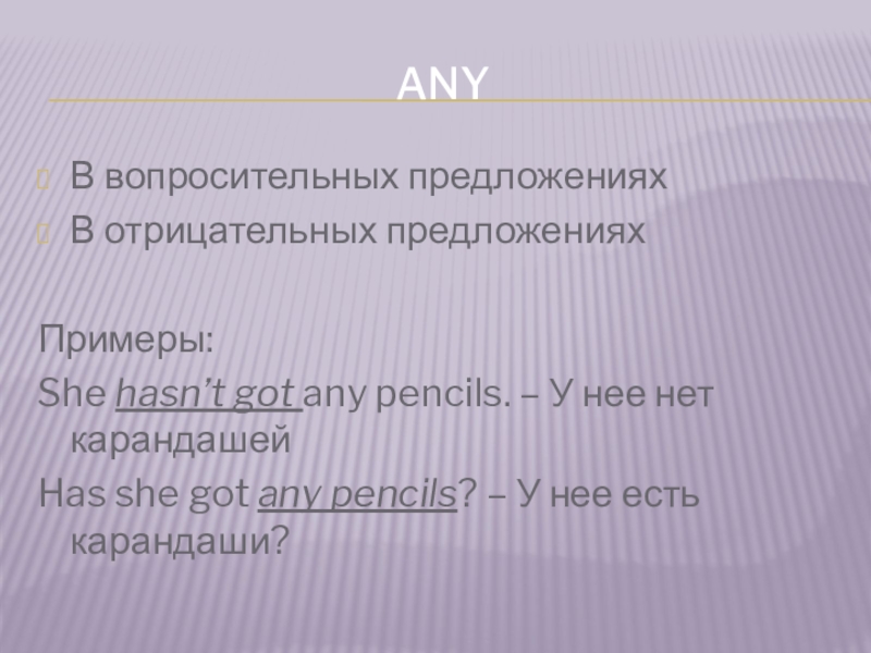 AnyВ вопросительных предложенияхВ отрицательных предложенияхПримеры:She hasn’t got any pencils. – У нее нет карандашей Has she got