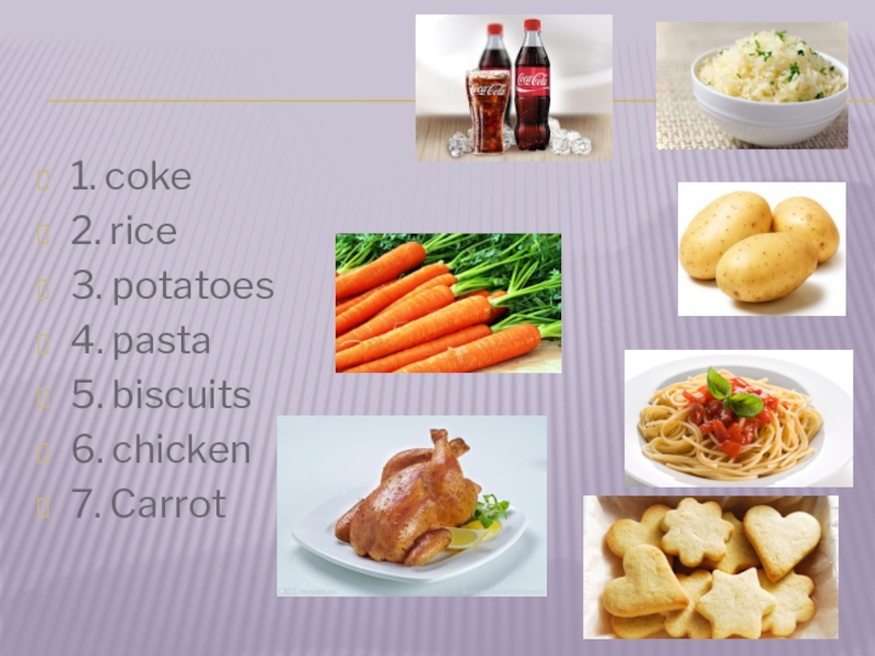 1. coke 2. rice3. potatoes 4. pasta 5. biscuits 6. chicken7. Carrot
