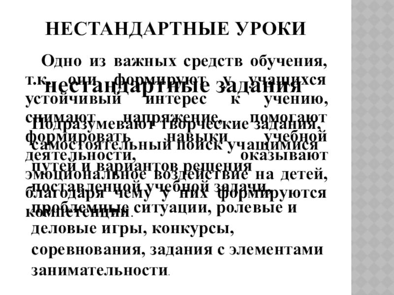 Подразумевают творческие задания, самостоятельный поиск учащимися путей и вариантов решения поставленной учебной задачи, проблемные ситуации, ролевые и деловые игры, конкурсы, соревнования, задания с элементами занимательности.