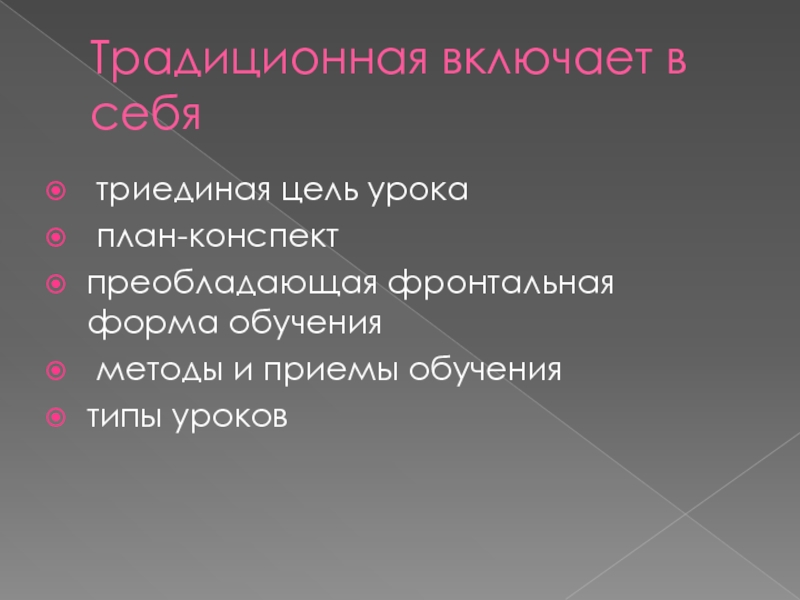 Традиционная включает в себя триединая цель урока план-конспектпреобладающая фронтальная форма обучения методы и приемы обучениятипы уроков