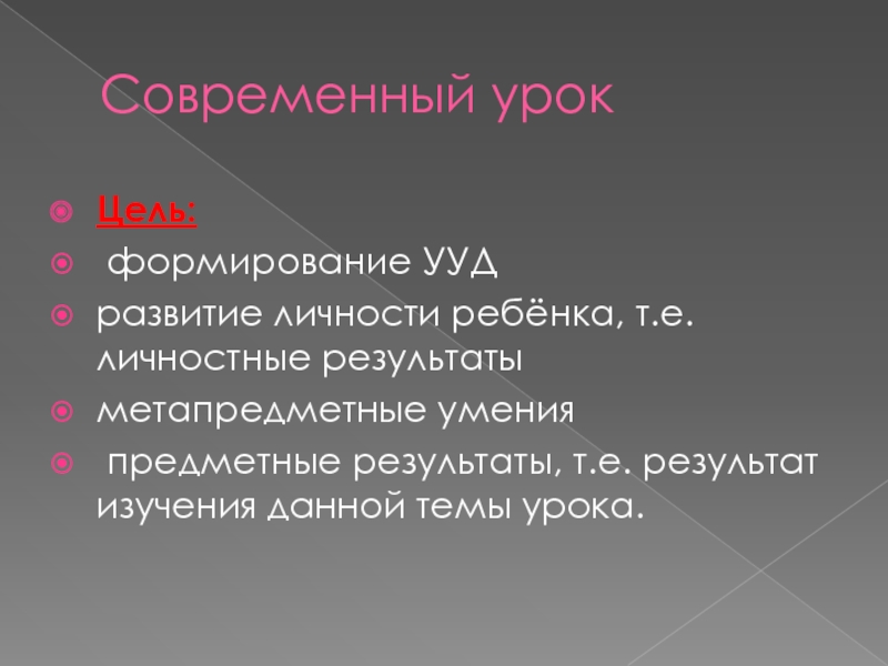 Современный урокЦель: формирование УУДразвитие личности ребёнка, т.е. личностные результатыметапредметные умения предметные результаты, т.е. результат изучения данной темы