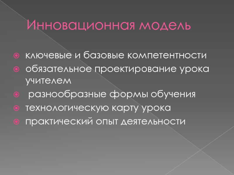 Инновационная модельключевые и базовые компетентностиобязательное проектирование урока учителем разнообразные формы обучениятехнологическую карту урокапрактический опыт деятельности