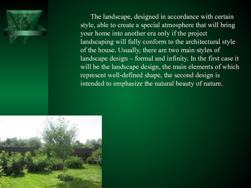 a special atmosphere that will bring your home into another era only if the project landscaping will fully conform to the architectural style of the house. Usually, there are two main styles of landscape design – formal and infinity. In the first case it will be the landscape design, the main elements of which represent well-defined shape, the second design is intended to emphasize the natural beauty of nature.
