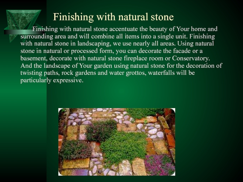 of Your home and surrounding area and will combine all items into a single unit. Finishing with natural stone in landscaping, we use nearly all areas. Using natural stone in natural or processed form, you can decorate the facade or a basement, decorate with natural stone fireplace room or Conservatory. And the landscape of Your garden using natural stone for the decoration of twisting paths, rock gardens and water grottos, waterfalls will be particularly expressive.