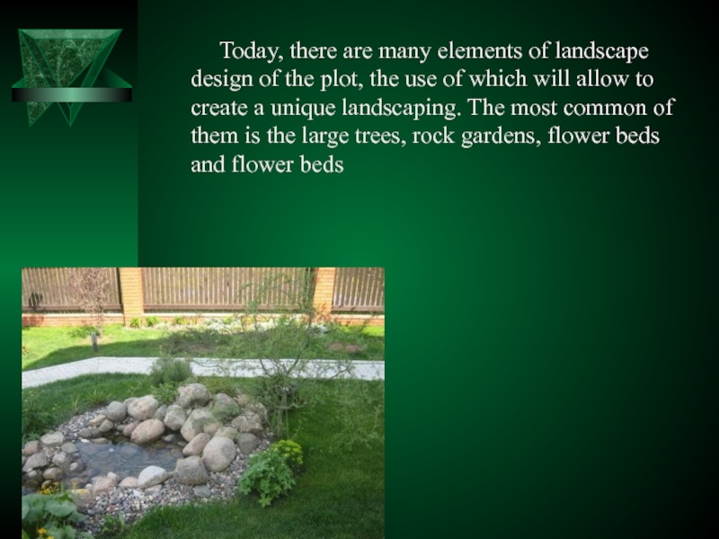 Слайд 7Today, there are many elements of landscape design of the plot,