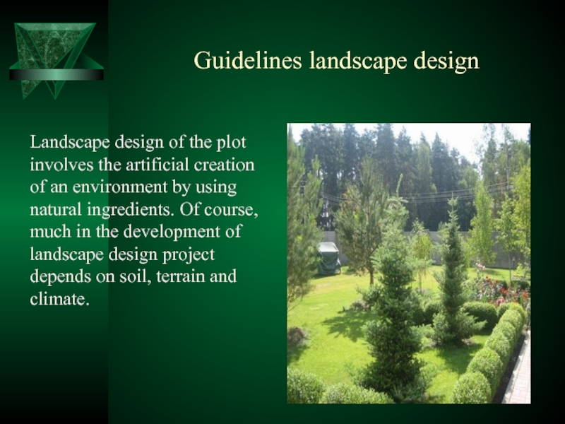 of an environment by using natural ingredients. Of course, much in the development of landscape design project depends on soil, terrain and climate.
