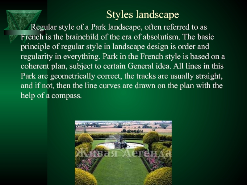 French is the brainchild of the era of absolutism. The basic principle of regular style in landscape design is order and regularity in everything. Park in the French style is based on a coherent plan, subject to certain General idea. All lines in this Park are geometrically correct, the tracks are usually straight, and if not, then the line curves are drawn on the plan with the help of a compass.
