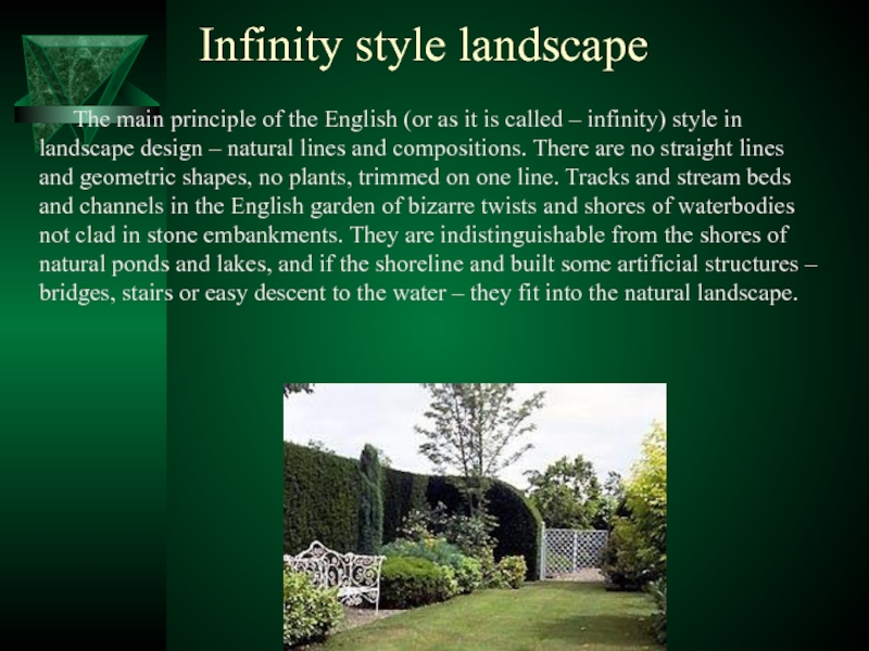 is called – infinity) style in landscape design – natural lines and compositions. There are no straight lines and geometric shapes, no plants, trimmed on one line. Tracks and stream beds and channels in the English garden of bizarre twists and shores of waterbodies not clad in stone embankments. They are indistinguishable from the shores of natural ponds and lakes, and if the shoreline and built some artificial structures – bridges, stairs or easy descent to the water – they fit into the natural landscape.