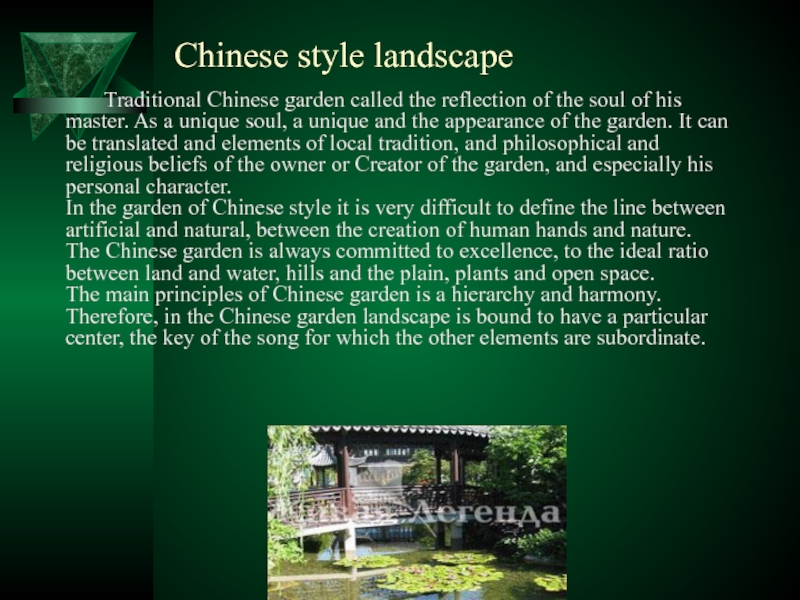 The main principles of Chinese garden is a hierarchy and harmony. Therefore, in the Chinese garden landscape is bound to have a particular center, the key of the song for which the other elements are subordinate.