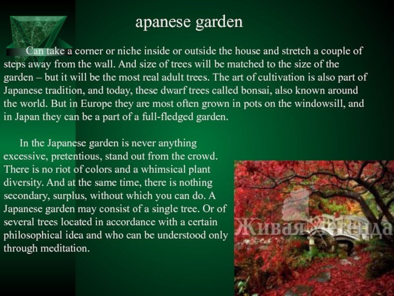 house and stretch a couple of steps away from the wall. And size of trees will be matched to the size of the garden – but it will be the most real adult trees. The art of cultivation is also part of Japanese tradition, and today, these dwarf trees called bonsai, also known around the world. But in Europe they are most often grown in pots on the windowsill, and in Japan they can be a part of a full-fledged garden.