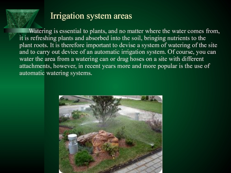 the water comes from, it is refreshing plants and absorbed into the soil, bringing nutrients to the plant roots. It is therefore important to devise a system of watering of the site and to carry out device of an automatic irrigation system. Of course, you can water the area from a watering can or drag hoses on a site with different attachments, however, in recent years more and more popular is the use of automatic watering systems.