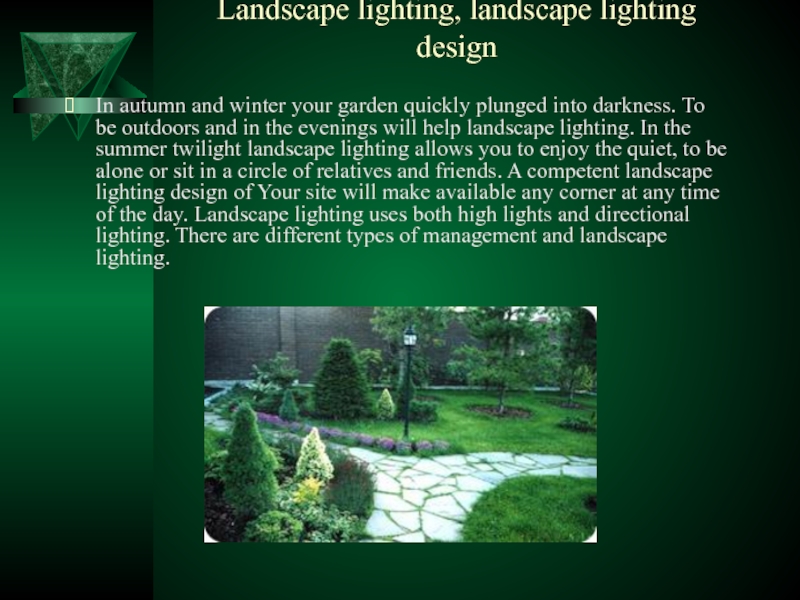quickly plunged into darkness. To be outdoors and in the evenings will help landscape lighting. In the summer twilight landscape lighting allows you to enjoy the quiet, to be alone or sit in a circle of relatives and friends. A competent landscape lighting design of Your site will make available any corner at any time of the day. Landscape lighting uses both high lights and directional lighting. There are different types of management and landscape lighting.