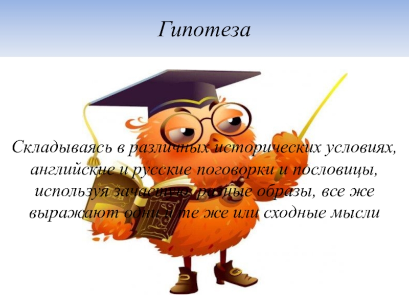 ГипотезаСкладываясь в различных исторических условиях, английские и русские поговорки и пословицы, используя зачастую разные образы, все же