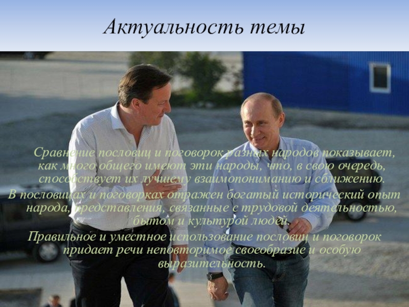 Актуальность темы Сравнение пословиц и поговорок разных народов показывает, как много общего имеют эти народы, что, в свою очередь, способствует их лучшему взаимопониманию и сближению. В пословицах и поговорках отражен богатый исторический опыт народа, представления, связанные с