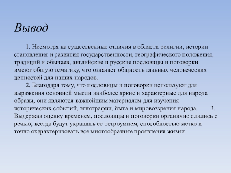 развития государственности, географического положения, традиций и обычаев, английские и русские пословицы и поговорки имеют общую тематику, что означает общность главных человеческих ценностей для наших народов. 2. Благодаря тому, что пословицы и поговорки используют для выражения основной мысли наиболее яркие и характерные для народа образы, они являются важнейшим материалом для изучения исторических событий, этнографии, быта и мировоззрения народа. 3. Выдержав оценку временем, пословицы и поговорки органично слились с речью; всегда будут украшать ее остроумием, способностью метко и точно охарактеризовать все многообразные проявления жизни.