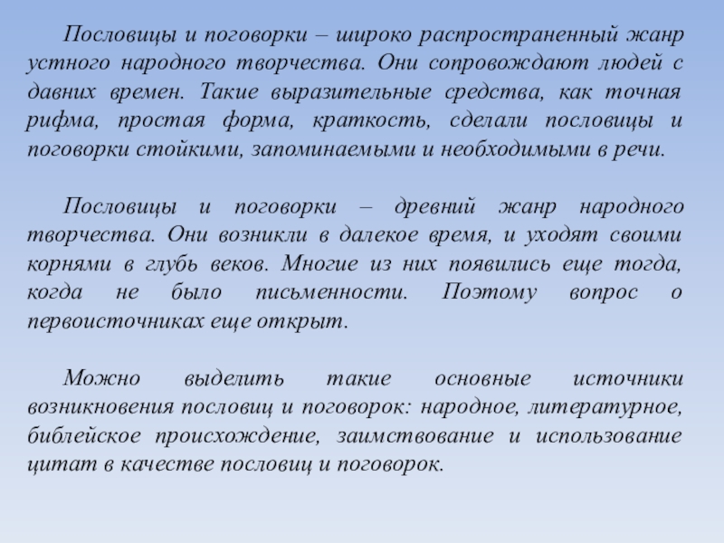 Можно выделить такие основные источники возникновения пословиц и поговорок: народное, литературное, библейское происхождение, заимствование и использование цитат в качестве пословиц и поговорок.