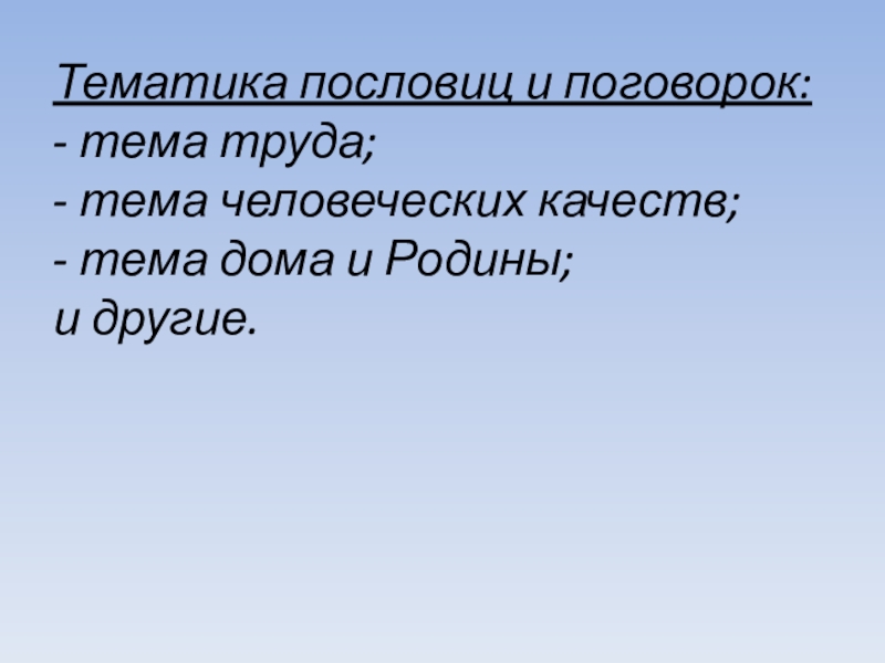 Слайд 7Тематика пословиц и поговорок: - тема труда; - тема человеческих качеств; - тема дома