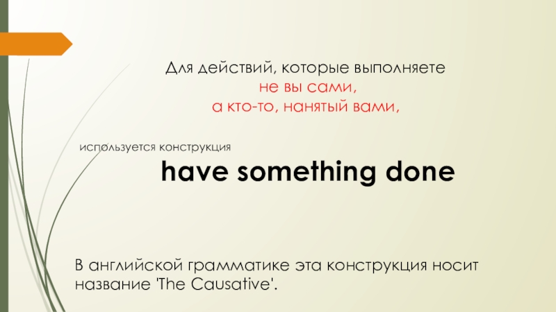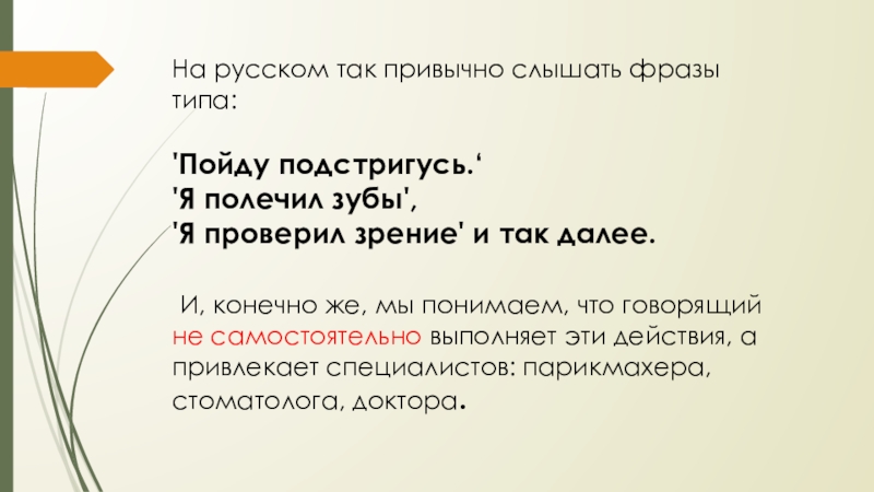 И, конечно же, мы понимаем, что говорящий не самостоятельно выполняет эти действия, а привлекает специалистов: парикмахера, стоматолога, доктора.