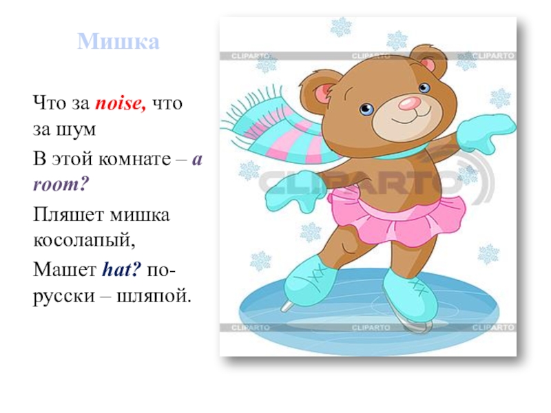 Мишка  Что за noise, что за шумВ этой комнате – а room?Пляшет мишка косолапый,Машет hat? по-русски