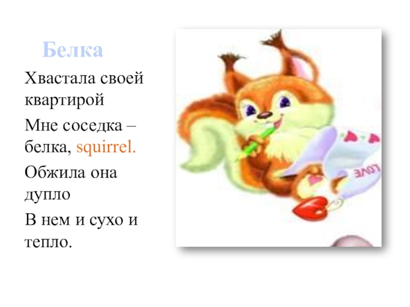 Белка Хвастала своей квартиройМне соседка – белка, squirrel.Обжила она дуплоВ нем и сухо и тепло.