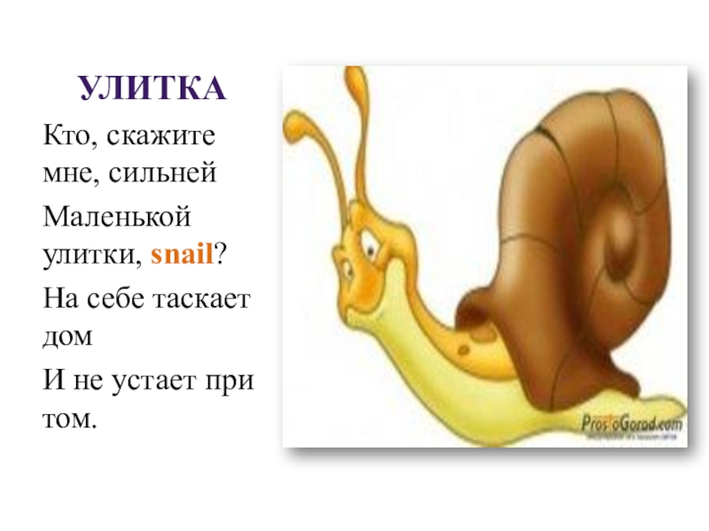 УлиткаКто, скажите мне, сильнейМаленькой улитки, snail?На себе таскает домИ не устает при том.