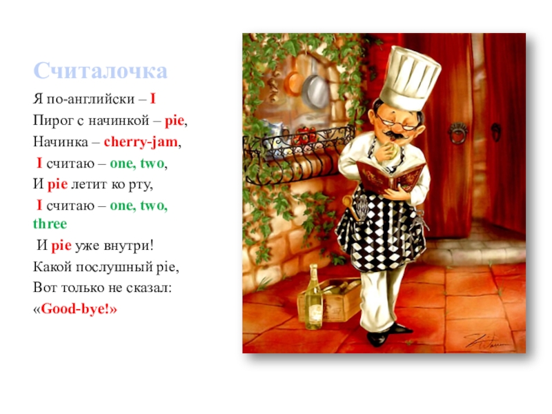 СчиталочкаЯ по-английски – IПирог с начинкой – pie,Начинка – cherry-jam, I считаю – one, two,И pie лeтит