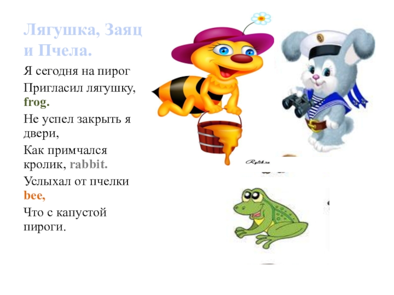 Лягушка, Заяц и Пчела.Я сегодня на пирогПригласил лягушку, frog.Не успел закрыть я двери,Как примчался кролик, rabbit.Услыхал от