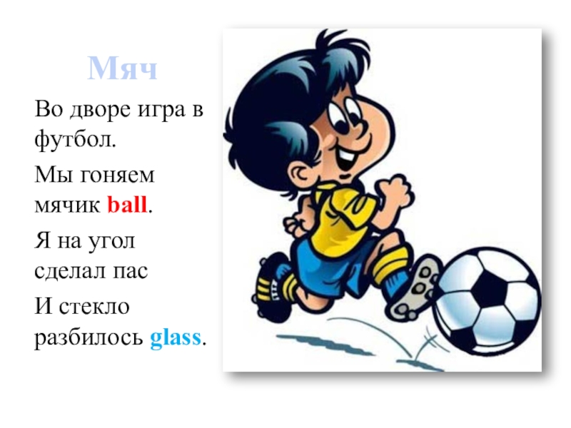 МячВо дворе игра в футбол.Мы гоняем мячик ball.Я на угол сделал пасИ стекло разбилось glass.