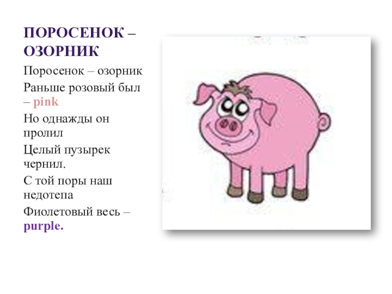 Поросенок – озорникПоросенок – озорникРаньше розовый был – pinkНо однажды он пролилЦелый пузырек чернил.С той поры наш