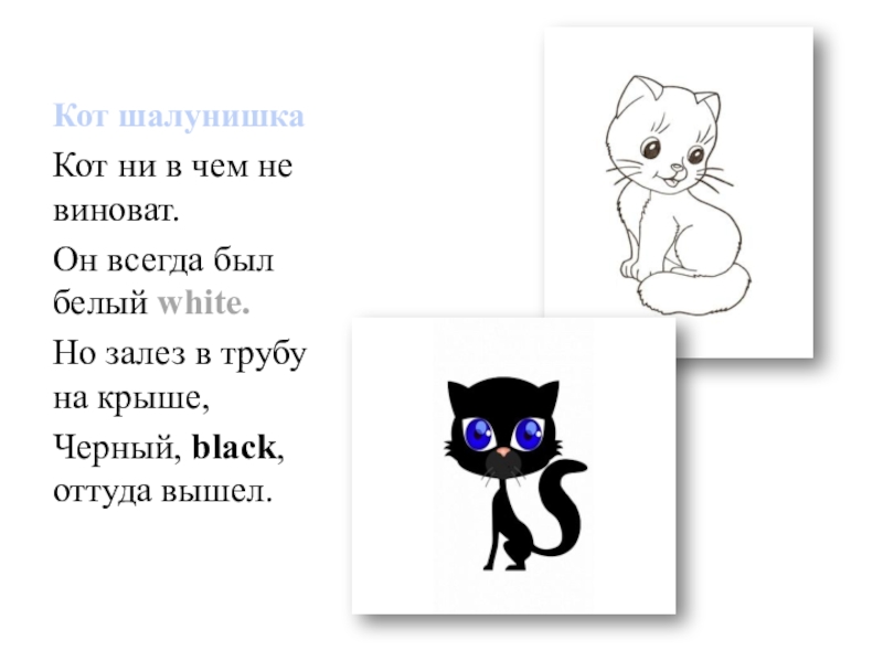 Кот шалунишкаКот ни в чем не виноват.Он всегда был белый white.Но залез в трубу на крыше,Черный, black,