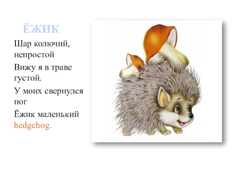 ЁЖИКШар колючий, непростойВижу я в траве густой.У моих свернулся ногЁжик маленький hedgehog.