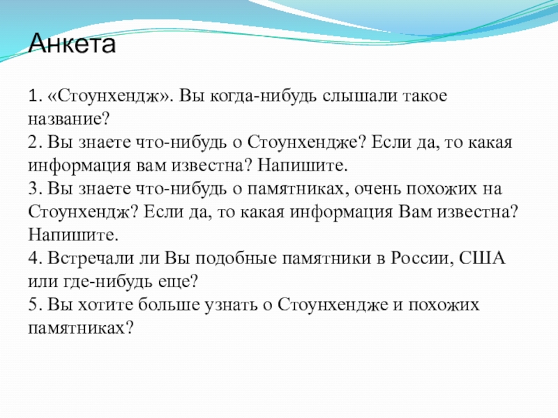 Анкета  1. «Стоунхендж». Вы когда-нибудь слышали такое название? 2. Вы знаете что-нибудь о Стоунхендже? Если да,