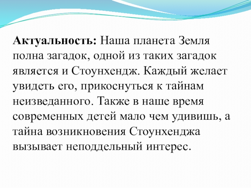 Актуальность: Наша планета Земля полна загадок, одной из таких загадок является и Стоунхендж. Каждый желает увидеть его, прикоснуться к тайнам неизведанного. Также в наше время современных детей мало чем удивишь, а тайна возникновения Стоунхенджа вызывает неподдельный