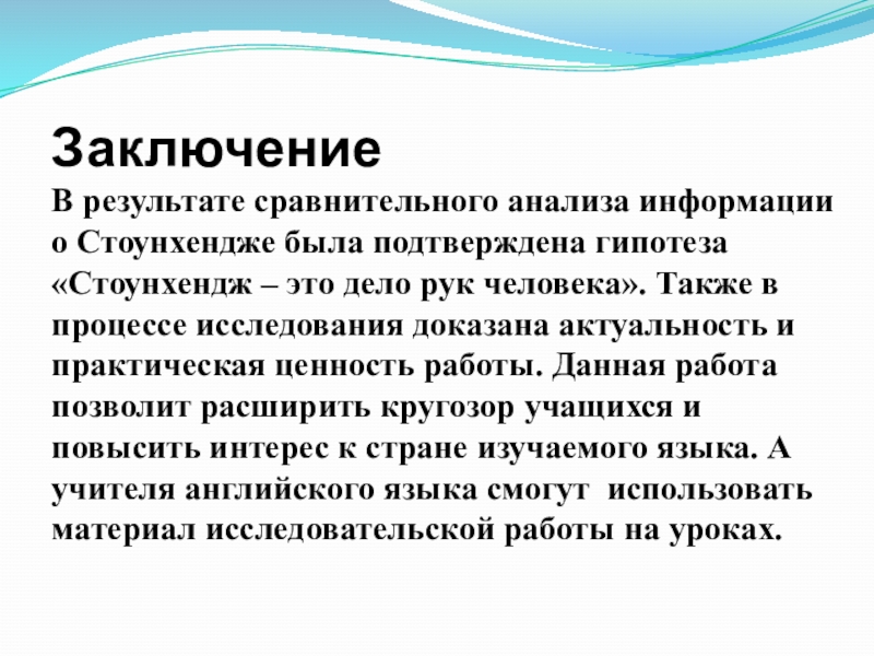 Слайд 12 Заключение В результате сравнительного анализа информации о Стоунхендже была подтверждена гипотеза «Стоунхендж