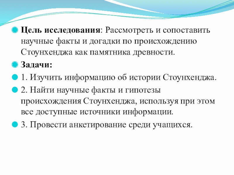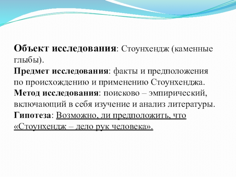 Объект исследования: Стоунхендж (каменные глыбы). Предмет исследования: факты и предположения по происхождению и применению Стоунхенджа. Метод исследования: