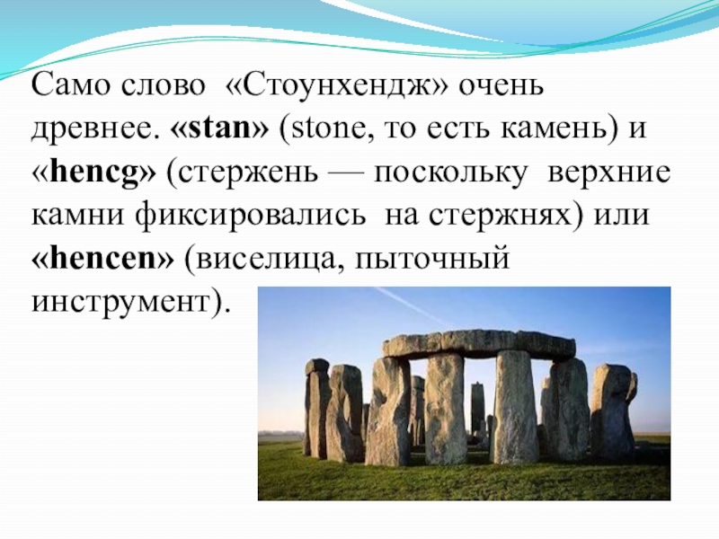 Слайд 5Само слово «Стоунхендж» очень древнее. «stan» (stone, то есть камень) и