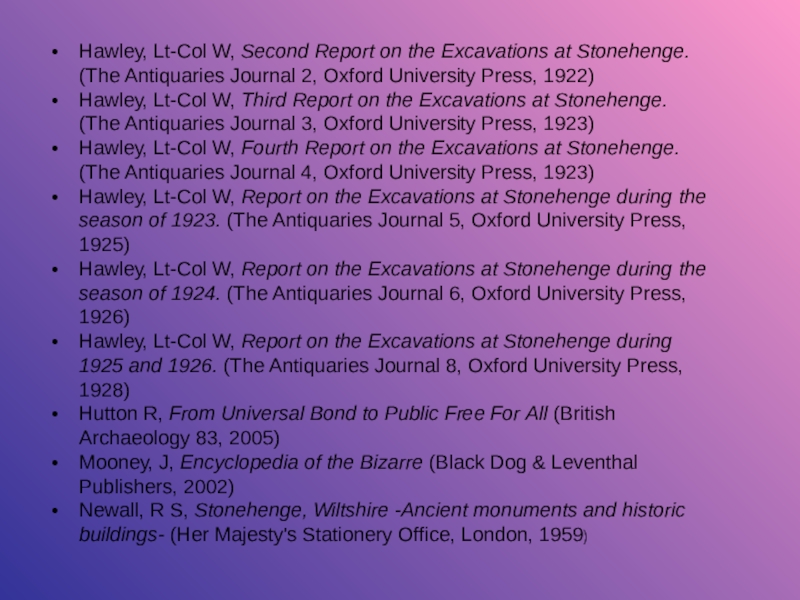Hawley, Lt-Col W, The Excavations at Stonehenge. (The Antiquaries Journal 1, Oxford University Press, 19-41). 1921.