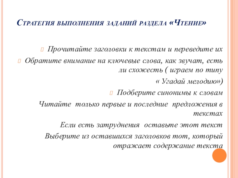 Слайд 5Стратегия выполнения заданий раздела «Чтение»