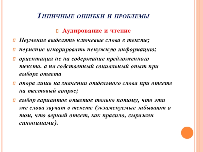 выбор вариантов ответов только потому, что эти же слова звучат в тексте (экзаменуемые забывают о том, что верный ответ, как правило, выражен синонимами).