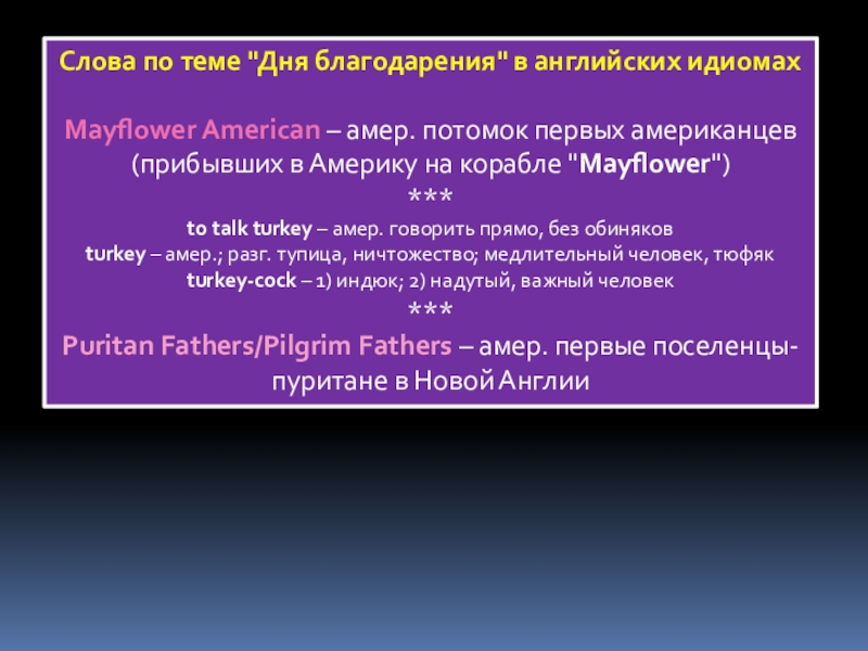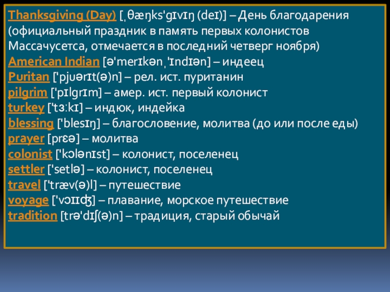 Слайд 2Thanksgiving (Day) [ˌθæŋks'gɪvɪŋ (deɪ)] – День благодарения (официальный праздник в память первых колонистов