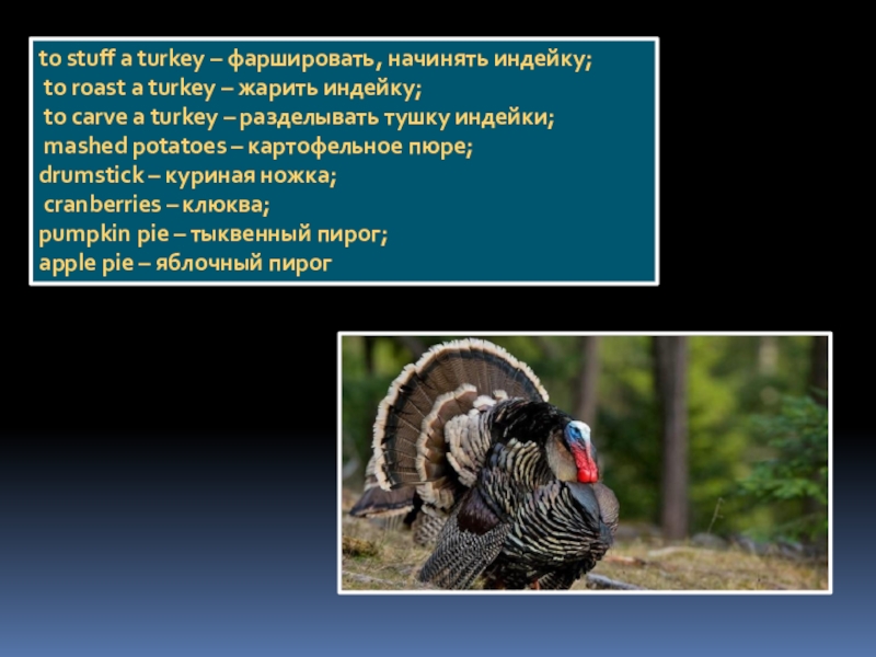 Слайд 5to stuff a turkey – фаршировать, начинять индейку;