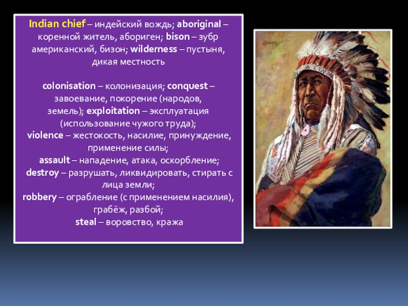 Слайд 26Indian chief – индейский вождь; aboriginal – коренной житель, абориген; bison – зубр американский, бизон; wilderness – пустыня,