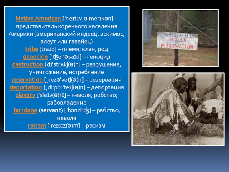 Native American ['neɪtɪvˌə'merɪkən] – представитель коренного населения Америки (американский индеец, эскимос, алеут или