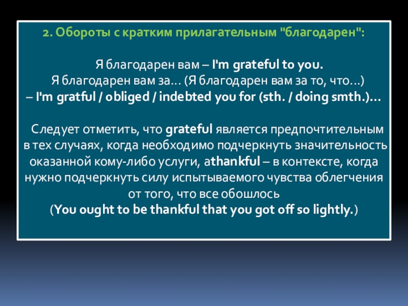 Слайд 102. Обороты с кратким прилагательным "благодарен":