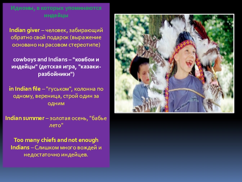 Слайд 28Идиомы, в которых упоминаются индейцы